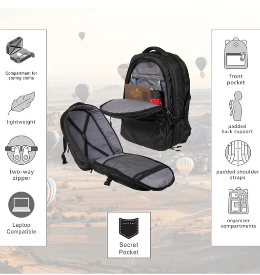 Introducing our versatile bag: with a padded laptop compartment in one section and a luggage organizer in the other. Its unique downward-opening front pocket includes an additional front pocket, complemented by four bottom pockets for extra storage.