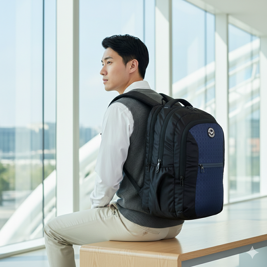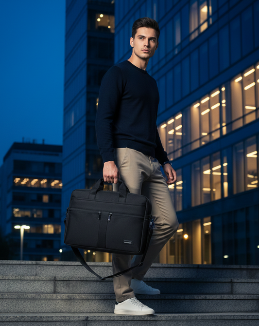 Introducing our versatile bag: with a padded laptop compartment in one section and a luggage organizer in the other. Its unique downward-opening front pocket includes an additional front pocket, complemented by four bottom pockets for extra storage.