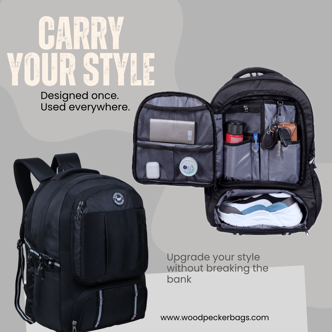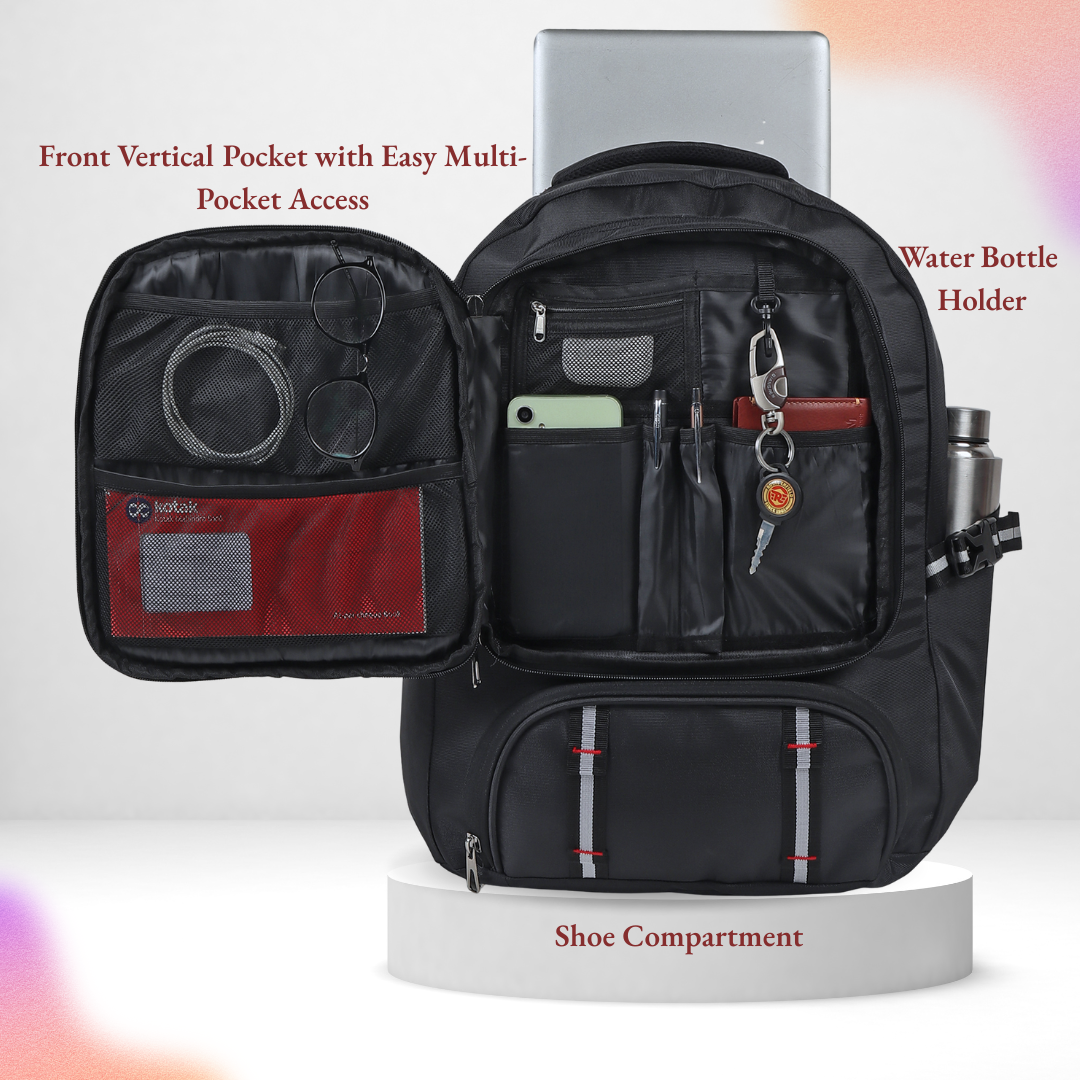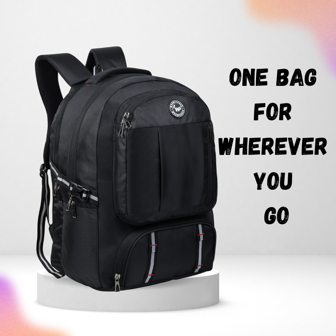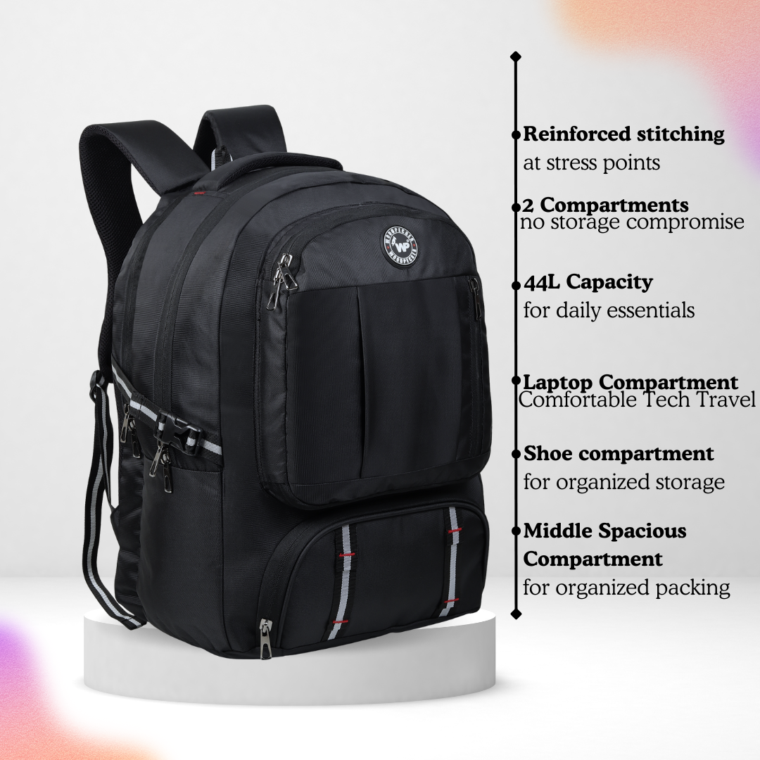 Built for everyday hustle and quick getaways, this multi‑utility backpack combines smart organization with rugged style. The 44L capacity, twin main compartments, and a roomy middle section give you ample space for books, clothes, and travel essentials, while the padded laptop compartment keeps your device secure on the move. A separate shoe compartment, easy‑access front organizer with multiple pockets, and side bottle holder ensure everything has its own place so you stay clutter‑free. Reinforced stitching, padded back panel, and cushioned shoulder straps deliver long‑lasting comfort, making this the one bag that’s always ready when you are.