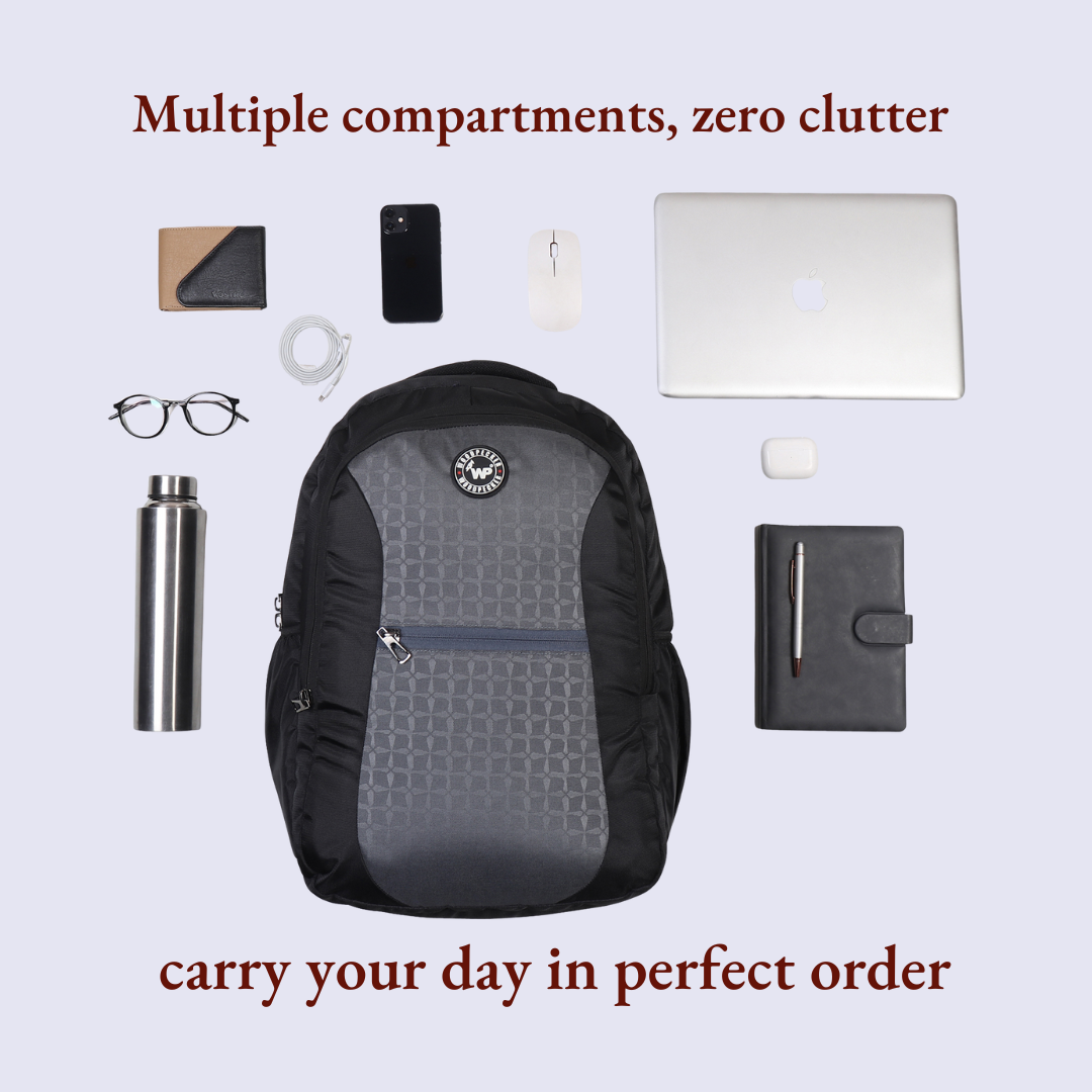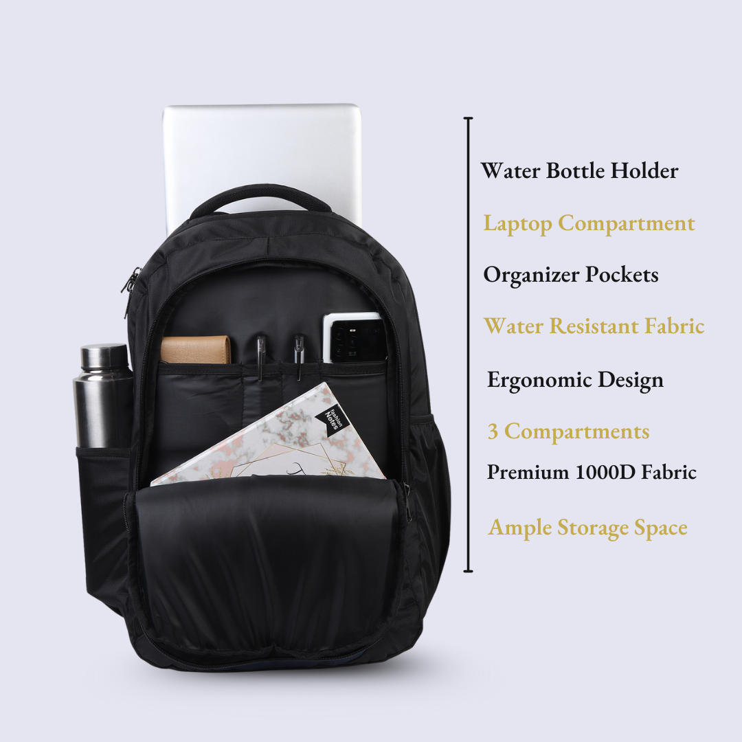 This three‑compartment laptop backpack is built to keep your routine streamlined, with separate sections for your device, books, and files so everything has its own place. A spacious front pocket with organizer slots neatly holds your wallet, phone, pens, and cables, while the side water bottle holder keeps hydration close at hand on busy days. Soft, padded back straps and an ergonomic profile provide comfortable support from commute to classroom to office, all wrapped in a smart two‑tone design that looks sharp wherever you carry it. Crafted from premium 1000D water‑resistant fabric and featuring an ergonomic design with padded straps and a side water‑bottle holder, this backpack delivers long‑lasting protection and all‑day comfort for commuting, travel, or class.