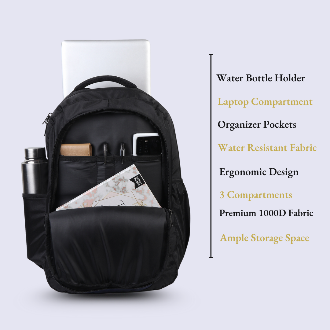 This three‑compartment laptop backpack keeps every part of your day in order, combining a dedicated laptop section with ample storage for books, files, and essentials. A large front pocket with organizer slots gives a fixed place for your wallet, pens, phone, and cables, while the side water bottle holder keeps hydration within easy reach. Padded back straps and an ergonomic design ensure comfortable carry through long commutes, classes, or workdays, all wrapped in a sleek, modern look that fits both office and campus. Made from premium 1000D water‑resistant fabric with an ergonomic design, padded straps, and a side water‑bottle holder, it offers durable protection and comfortable carry whether commuting, travelling, or heading to class.